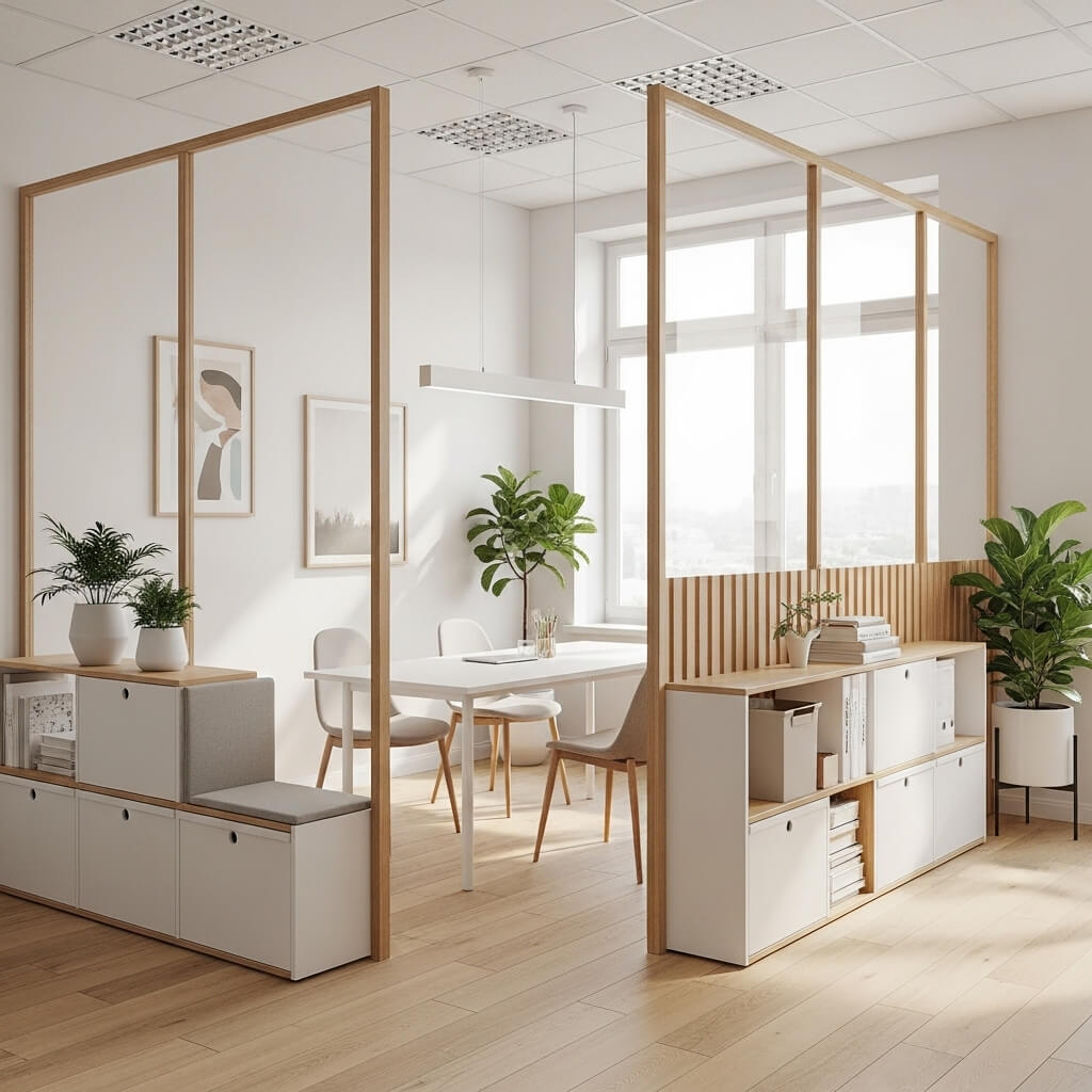Consider dual-purpose partitions that serve multiple functions—storage on one side, writable surface on the other, or integrated technology that serves adjacent zones. In small spaces, everything should work harder and smarter.