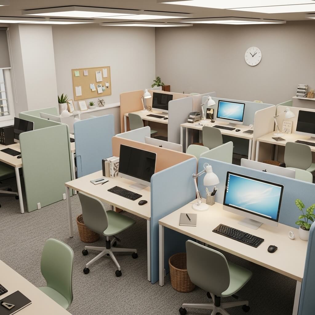 The secret sauce is in the height and materials. Keep panels low enough for easy communication but high enough for visual privacy when seated. Choose materials with clean finishes—think white laminate, light wood veneer, or even upholstered panels in muted tones.