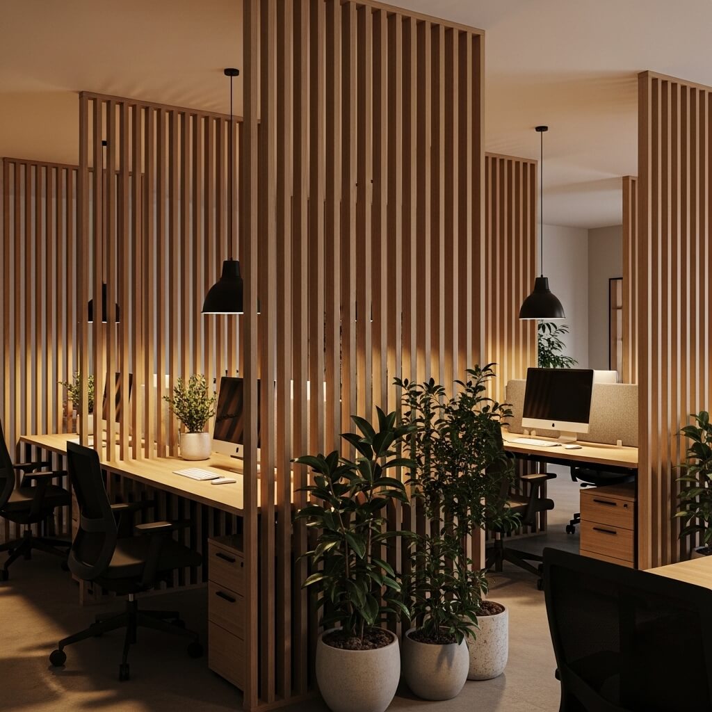 Now here’s where things get interesting. Wooden slat partitions bring that warm, organic feel that glass just can’t match. I’m talking about those beautiful vertical or horizontal wood slats that create visual separation while maintaining airflow and partial sight lines.