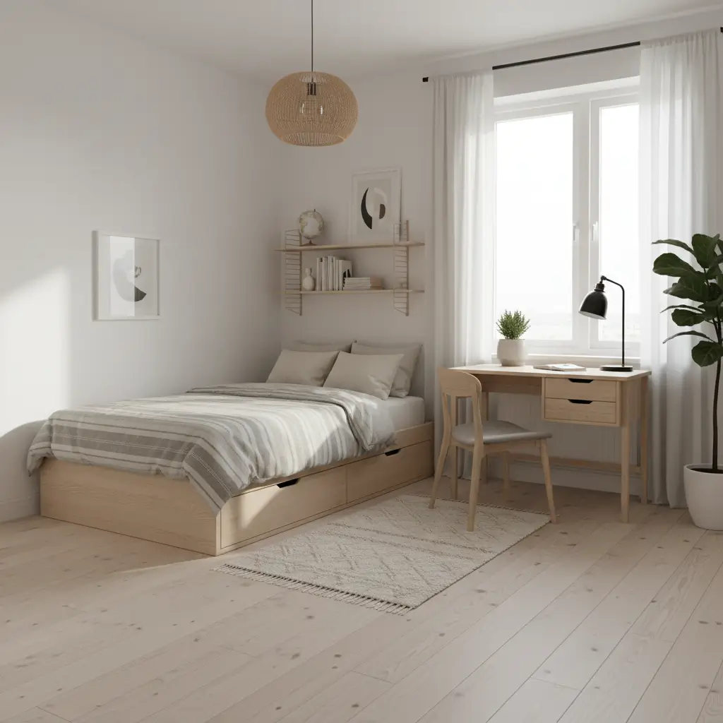 The room uses a neutral color palette (whites, grays, light woods) with black accents for contrast. We kept furniture minimal – platform bed with storage, floating desk, one quality chair, and open shelving. The lack of clutter creates this calm, focused environment that actually helps with studying and sleep.