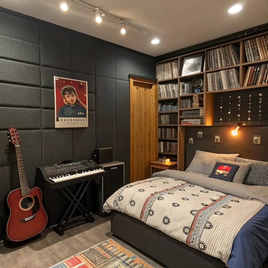 Music-obsessed older boys need bedrooms that celebrate their passion while remaining functional. The challenge is incorporating instruments and equipment without the room looking like a Guitar Center exploded. I designed a music studio bedroom for my guitarist nephew that balances his musical needs with actual living space.