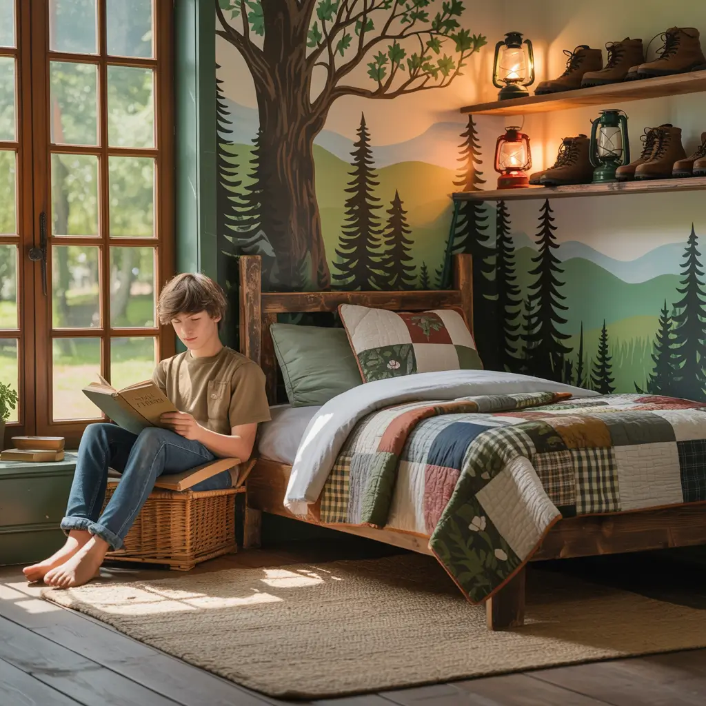 Outdoor adventure themes appeal to older boys who love camping, hiking, and nature exploration. The key is making it feel like a mountain retreat rather than a themed hotel room. I designed an adventure room for my 15-year-old nephew after his Scouts experience sparked an outdoor obsession.