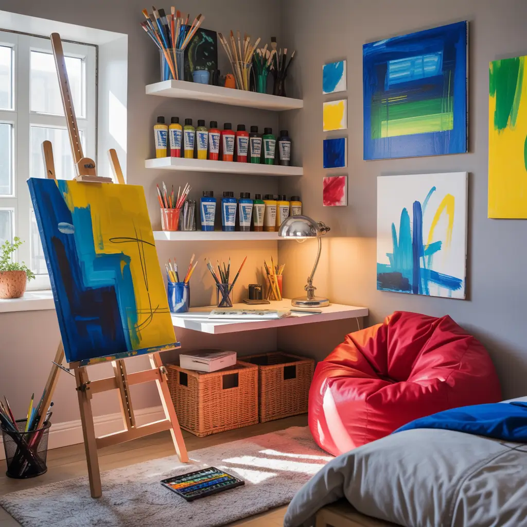 The digital integration matters for modern artists. His setup includes a quality monitor for digital art, charging stations for tablets and styluses, and a proper chair that supports long creative sessions. The room functions as a legitimate studio space that happens to include a bed.