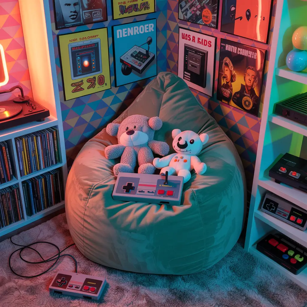We incorporated geometric patterns, neon accent colors, vintage posters (actual originals from eBay), and retro tech displays. The color palette includes electric blues, hot pinks, and black against white walls. The room feels like a time capsule while remaining functional for modern needs.