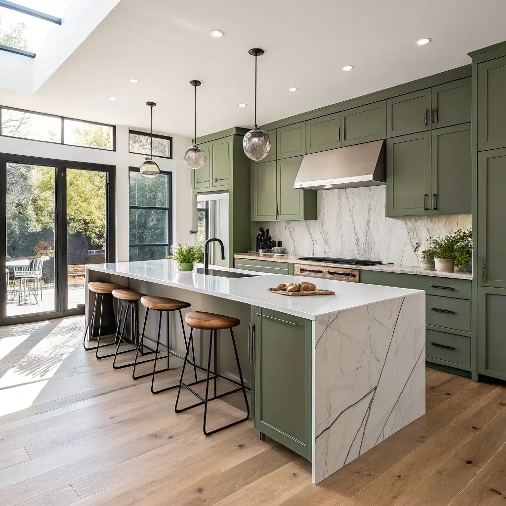 Transitional kitchens mix traditional elements (like shaker doors) with modern touches (like waterfall edges). Olive green acts as the perfect neutral-but-not-boring backdrop for this style mixing.