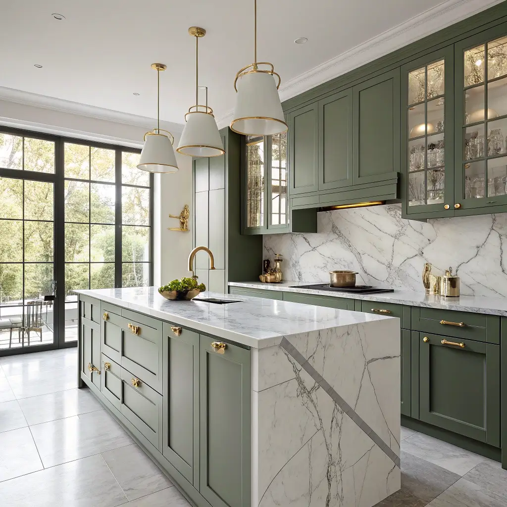 3. Olive Green Cabinets Paired with Marble Countertops