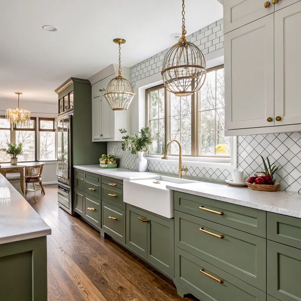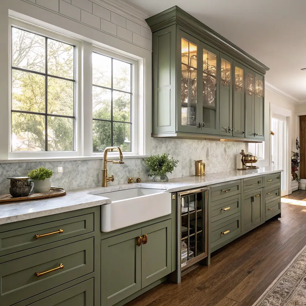 Transitional style bridges traditional and contemporary, and olive green cabinets work perfectly in this balanced approach. You get the best of both worlds without committing fully to either.