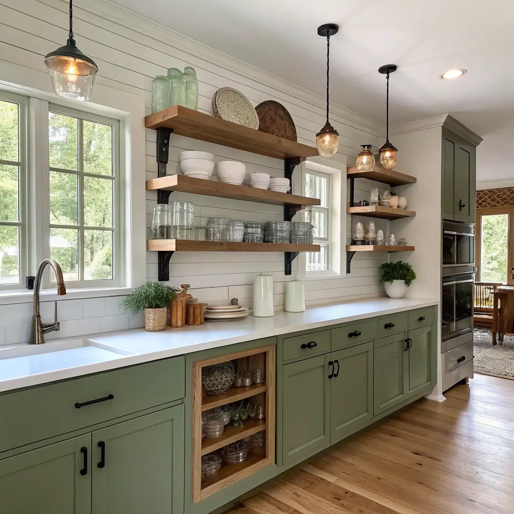 Replace upper cabinets with floating shelves, but don’t go overboard. Too much open shelving with olive lowers makes kitchens feel bottom-heavy. I learned this after removing too many uppers and having to reinstall some.