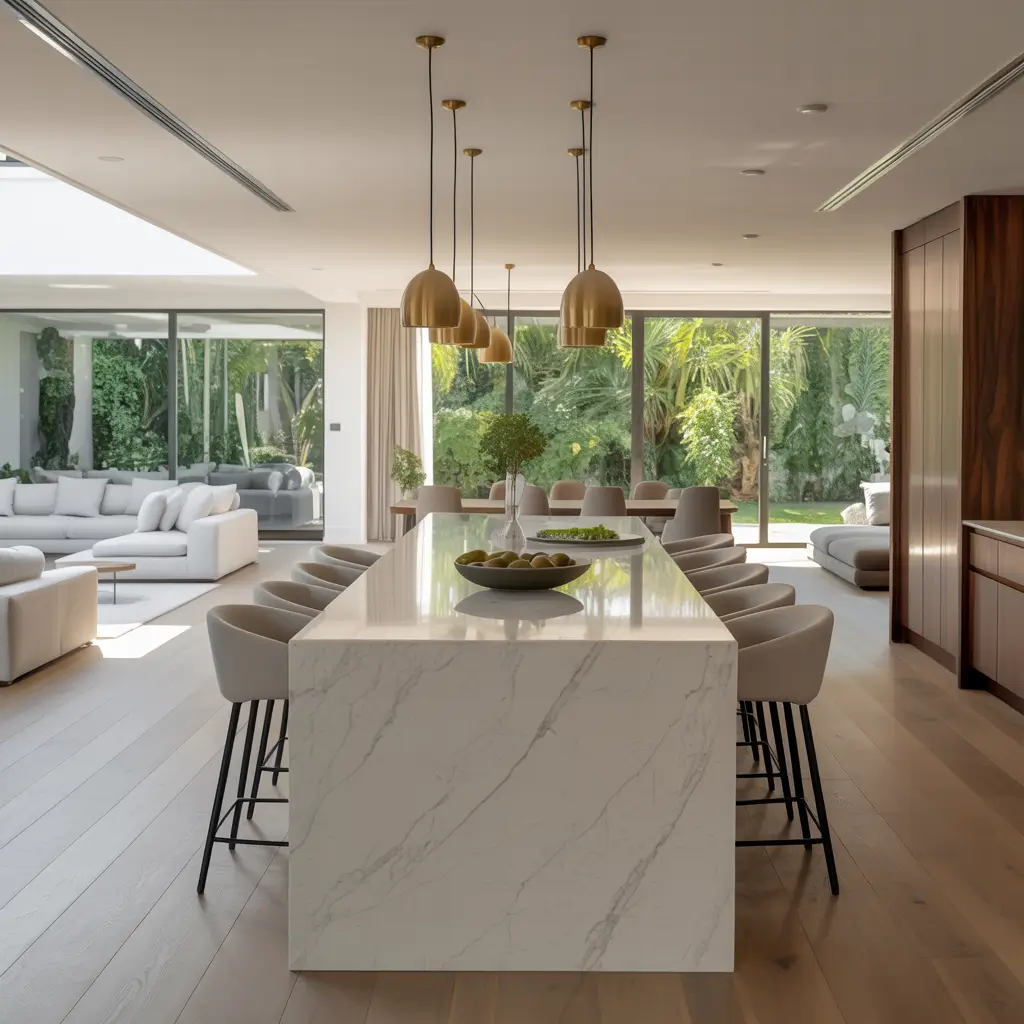 Statement islands in open concepts become the gravitational center of all three zones. Our oversized marble island gets more action than any other surface—prep space, dining table, homework station, and party central.