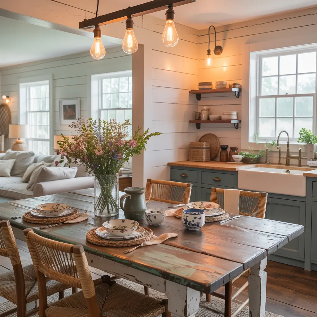 What makes farmhouse open plans special is their built-in character. Distressed wood, mixed metals, and vintage finds add layers of interest that minimal designs can’t match. Plus, farmhouse style is forgiving – a little wear and tear just adds to the charm.