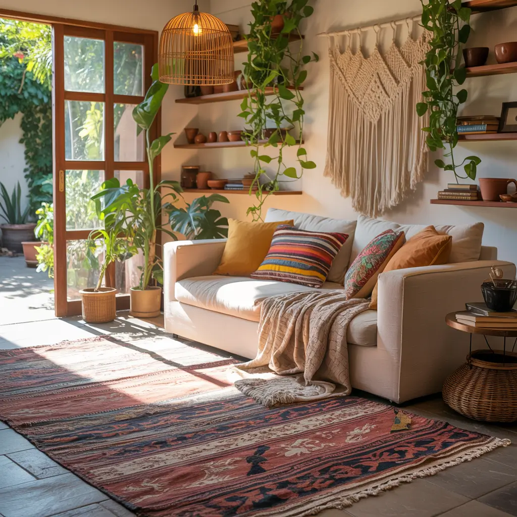 The secret to boho style is intentional layering. Yes, you can mix patterns, but they need a common thread. Maybe it’s a color that repeats, a texture that echoes, or a theme that ties things together. Without walls to separate zones, this cohesion becomes even more important.