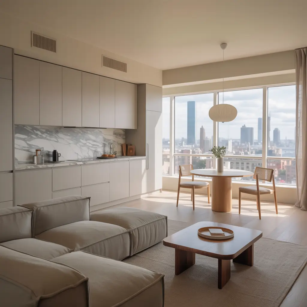 I learned compact living the hard way in my first city apartment. The kitchen island doubled as dining table, the sofa separated living from sleeping areas, and built-in storage hid everything else. The open plan was essential – walls would have made it feel like a shoebox.