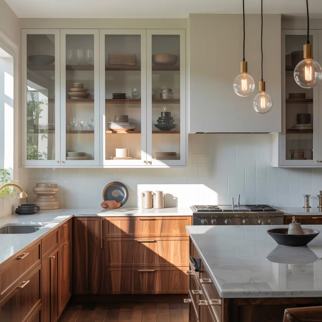Can’t fully commit to open shelving? Glass front cabinets offer the best of both worlds – visibility without the dust factor. This hybrid approach saved my sanity when I realized my open shelves were becoming dust magnets.