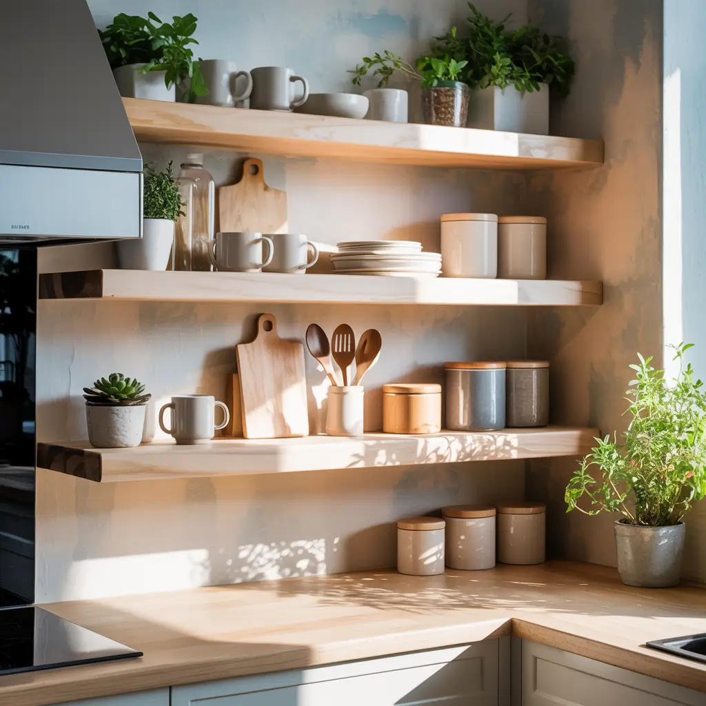 Corner space in kitchens usually goes to waste, but floating corner shelves turn dead zones into design features. I discovered this solution when trying to figure out what to do with an awkward corner that collected mail and keys.