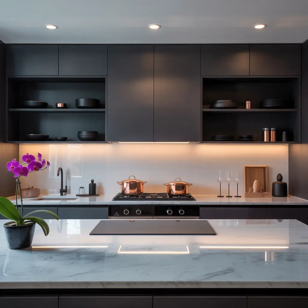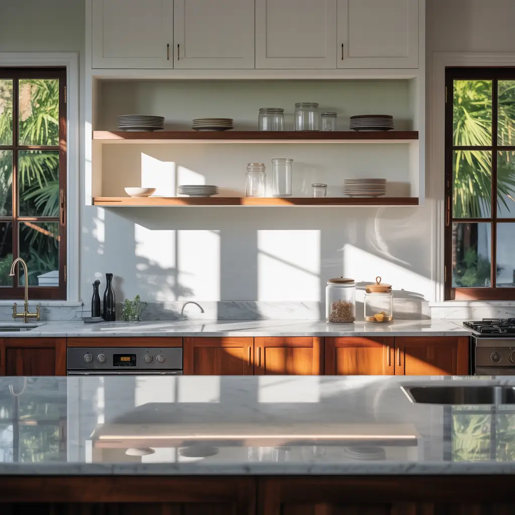 White open cabinets might sound basic, but they’re the little black dress of kitchen design – classic, versatile, and always in style. I installed these in my first apartment, and they made that shoebox kitchen feel twice as big.