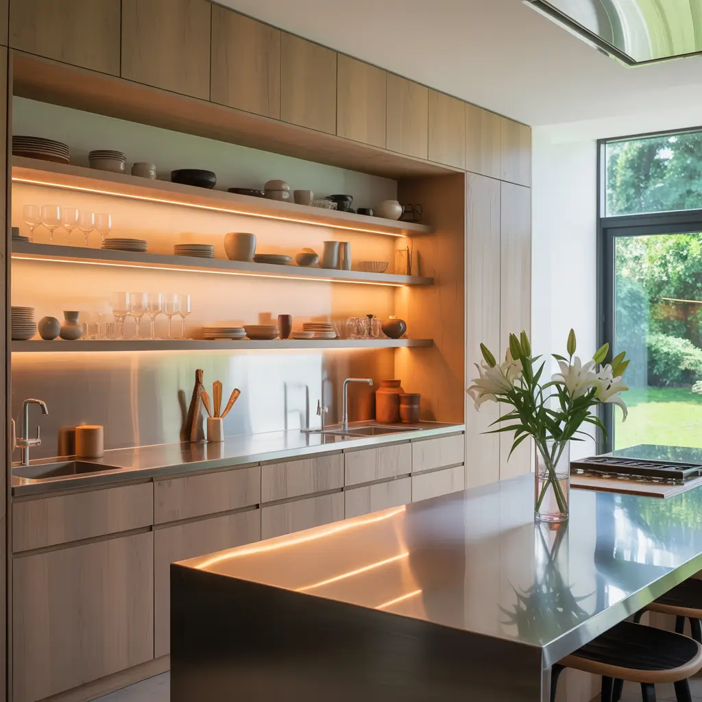 I installed LED strips under each shelf, hidden behind a small lip so you see the glow, not the source. The effect at night is stunning – my dishes look like they’re floating. Plus, task lighting while cooking improved dramatically.