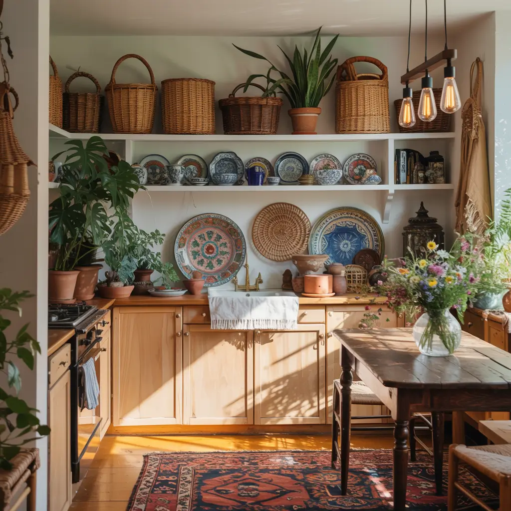 Boho style embraces imperfection and mixing textures. Natural wood cabinets with visible grain provide the perfect backdrop for eclectic collections. This style gave me permission to display my thrift store finds alongside everyday dishes.