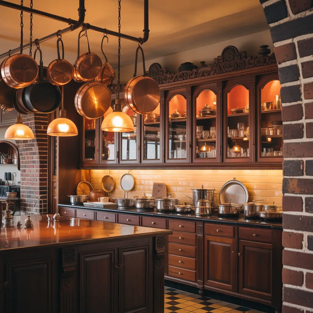 Vintage kitchens with copper accents create this timeless elegance that never goes out of style. Copper develops a patina over time, making your kitchen look better with age rather than worn out. It’s like the fine wine of kitchen materials.