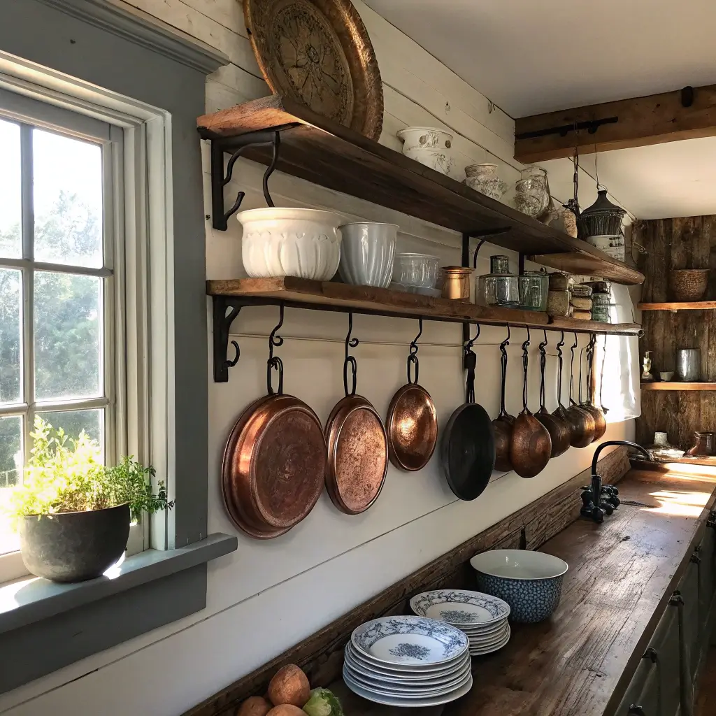 Layer different textures and materials on your shelves. I combine smooth ceramics, rough wooden bowls, and shiny copper pieces. The variety creates visual interest while maintaining that collected-over-time authenticity.