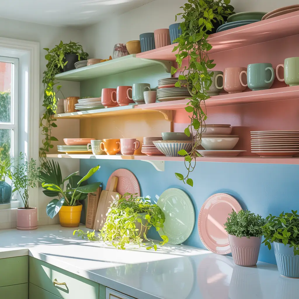 Who says kitchen shelves have to be wood or white? Painted shelves in unexpected colors turn storage into a statement. I painted the inside backs of my shelves sage green, and suddenly my white dishes looked like they were floating on a meadow.