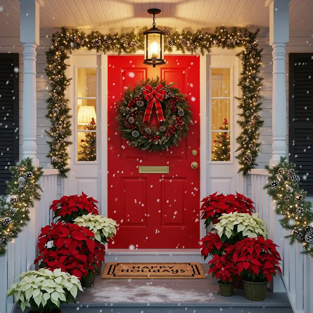Layer different elements for depth. Place potted evergreens on either side of the door, wrap them with lights, add a festive doormat, hang a wreath, and suddenly your porch tells a story. The goal is making guests feel like they’re entering someplace special before they even knock.