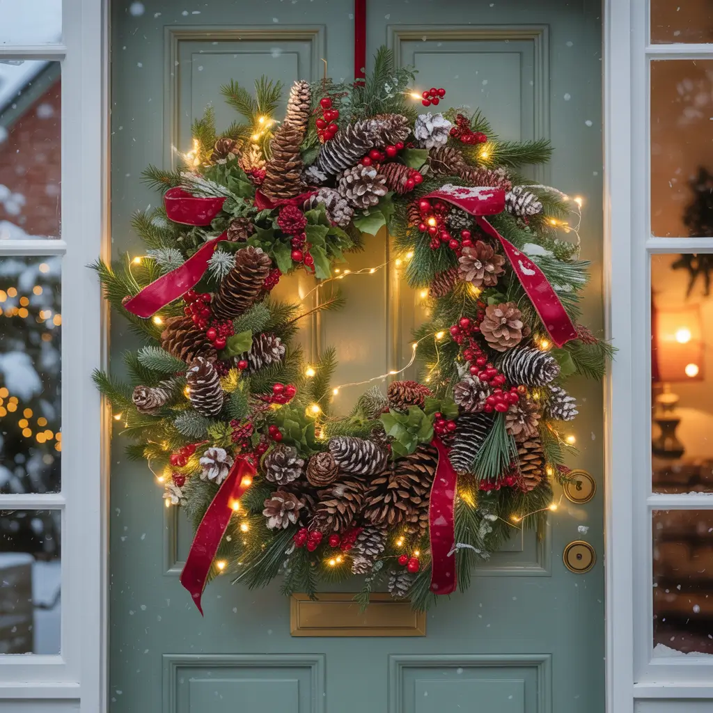 Start by framing your door with garland – and I mean really frame it, not just slap some greenery on top and call it done. Weave lights through the garland, add ribbons, tuck in ornaments, go wild. My rule is if you can still see the door frame clearly, you need more garland.