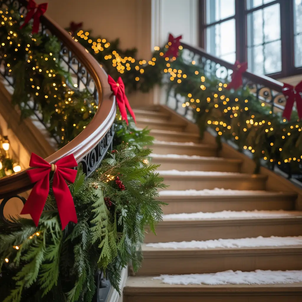 I use zip ties painted to match my rails (game-changer for invisible securing) and wrap artificial garland in a candy-cane spiral pattern. Real garland looks amazing for about three days before turning brown and shedding everywhere. Quality artificial garland wrapped with lights and ribbons looks fantastic all season.