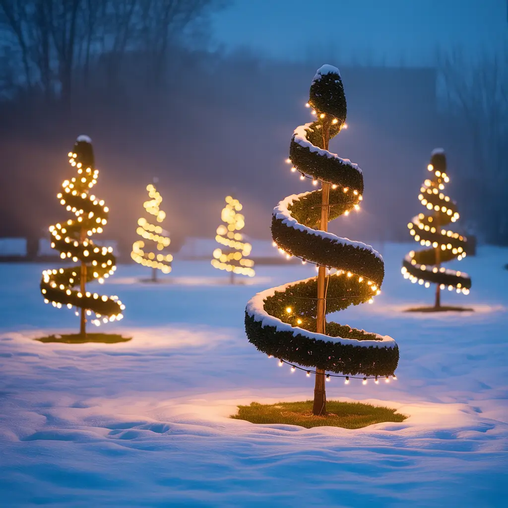 I make mine using tomato cages turned upside down (seriously), wrapped with lights from bottom to top. Start with more lights than you think you need – sparse topiary trees look sad. My 4-foot trees each use about 300 lights for proper density.