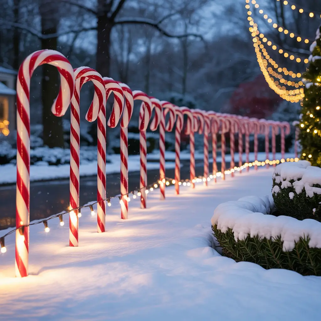 Space candy canes evenly along both sides of your driveway – I use 4-foot spacing for balance between impact and budget. Solar-powered versions work great for long driveways where running extension cords would be insane. Mixing sizes (alternating large and small) creates rhythm and visual interest.
