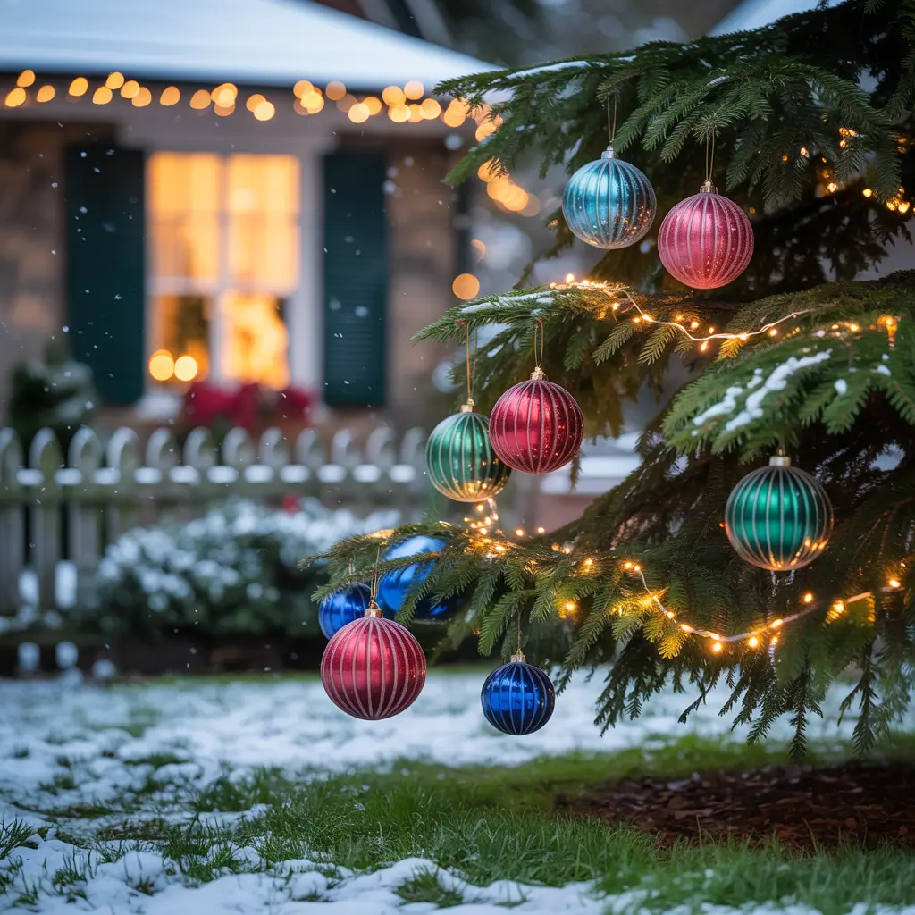 Use shatterproof ornaments unless you enjoy cleaning up glass shards from frozen grass. I hang them at varying heights using fishing line, which becomes invisible from a distance. Large ornaments make more impact than tiny ones that disappear against branches.