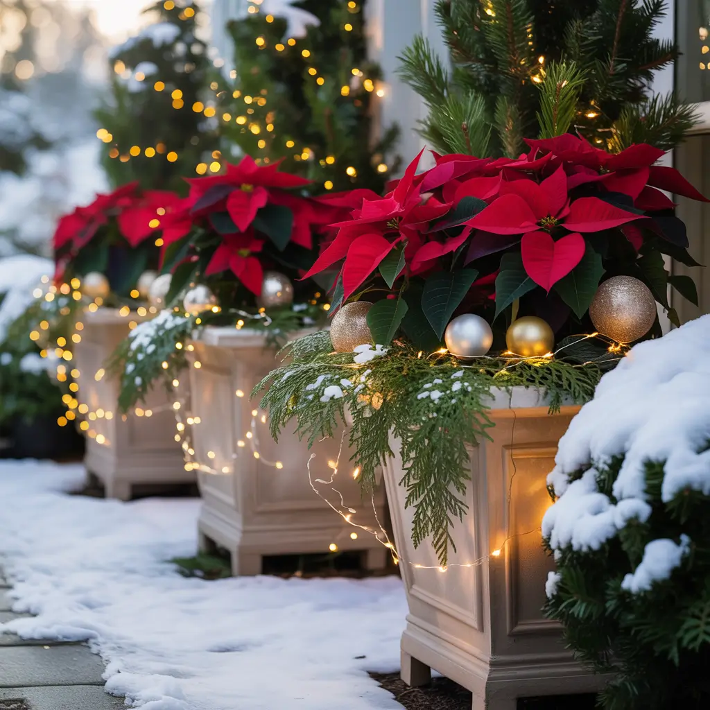 I fill large planters with evergreen branches, colorful dogwood stems, and battery-operated light branches. Add oversized ornaments on sticks for height, and trail lights or ribbon over the edges. The combination of natural and artificial elements creates fullness that lasts all season.