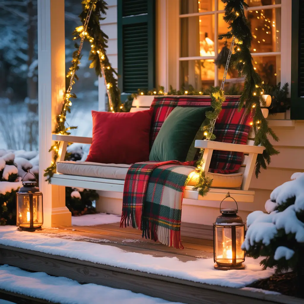 Layer the swing with weather-resistant pillows in holiday colors, add a cozy plaid blanket, and wrap the chains with garland and lights. I hang ornaments from the chains at varying heights for movement and sparkle. Battery-operated lights woven through the back slats create a glowing backdrop.