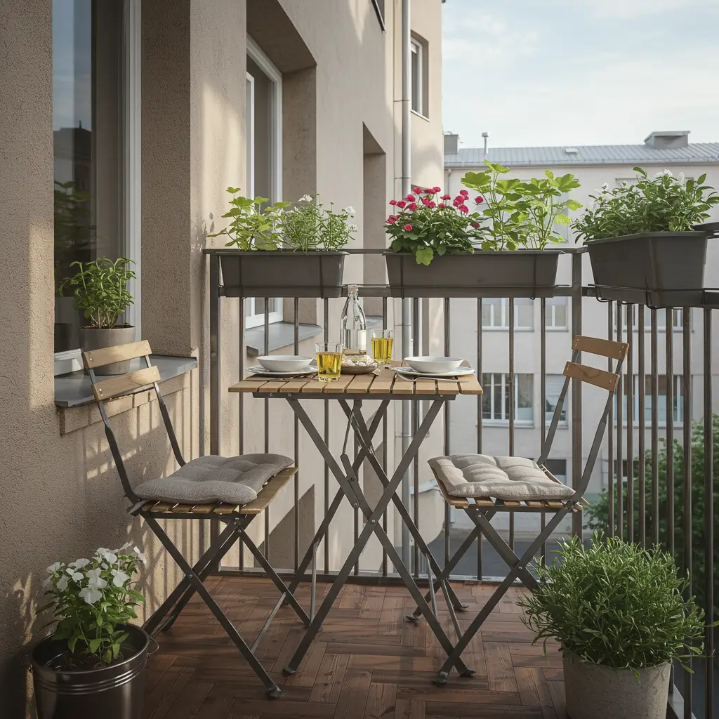 Balcony dining succeeds through multi-functional furniture and vertical solutions. Every piece needs to earn its limited space by serving multiple purposes.
