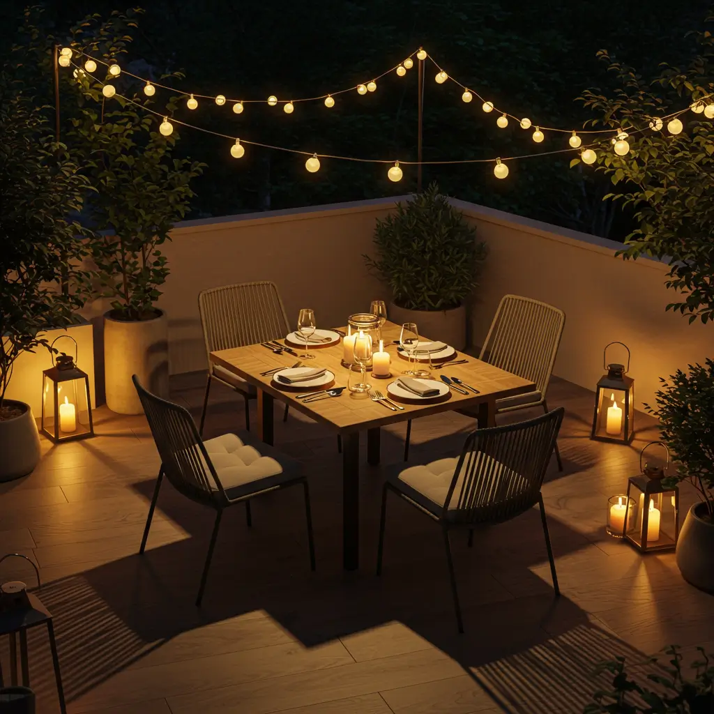 I installed solar path lights, candles in hurricanes, and warm white string lights throughout my dining area. The transformation at dusk is incredible — what looks nice during the day becomes enchanting at night.