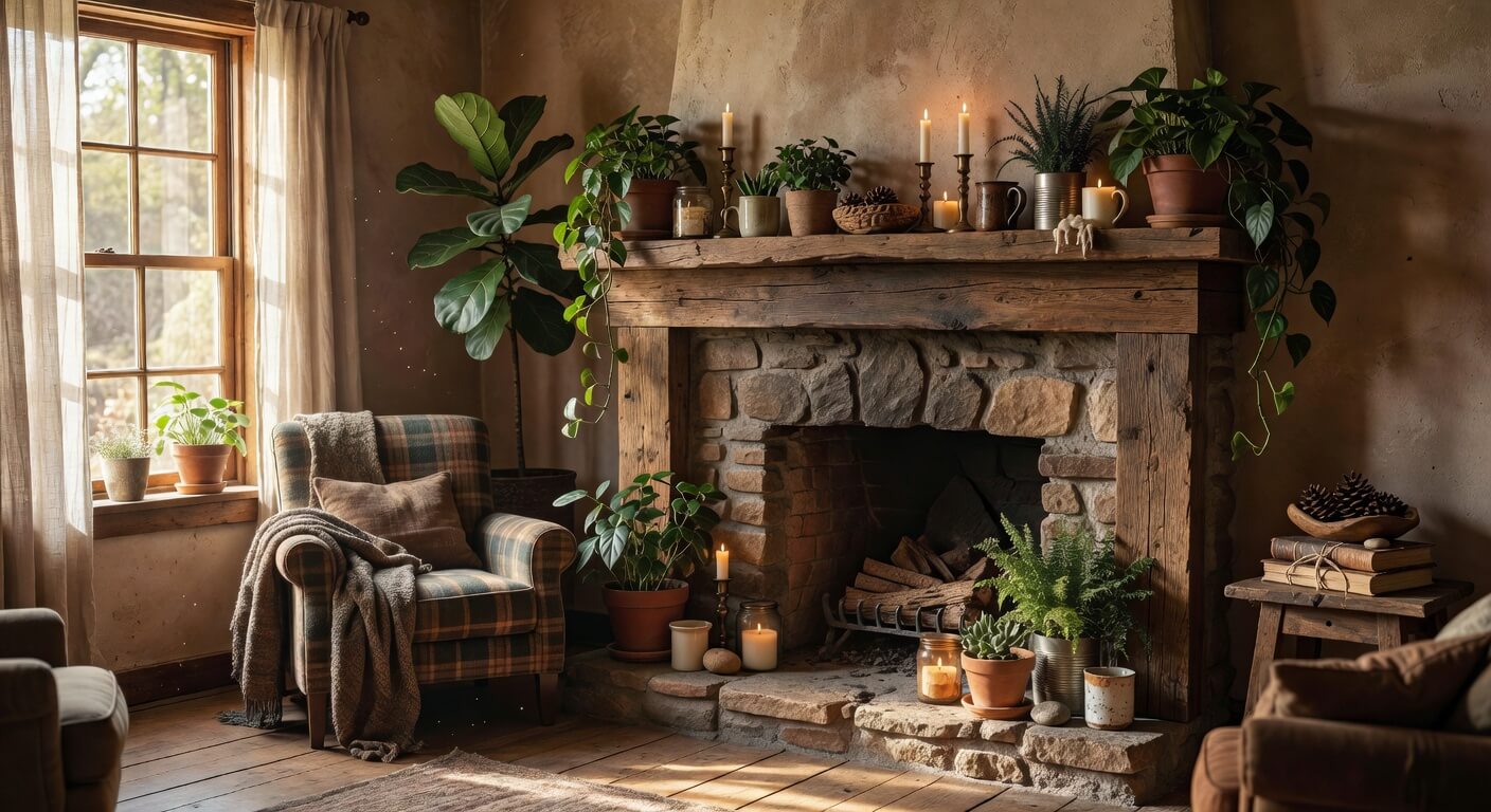 A rustic wooden mantel with greenery creates warmth almost instantly. It feels cozy, grounded, and welcoming without trying too hard.