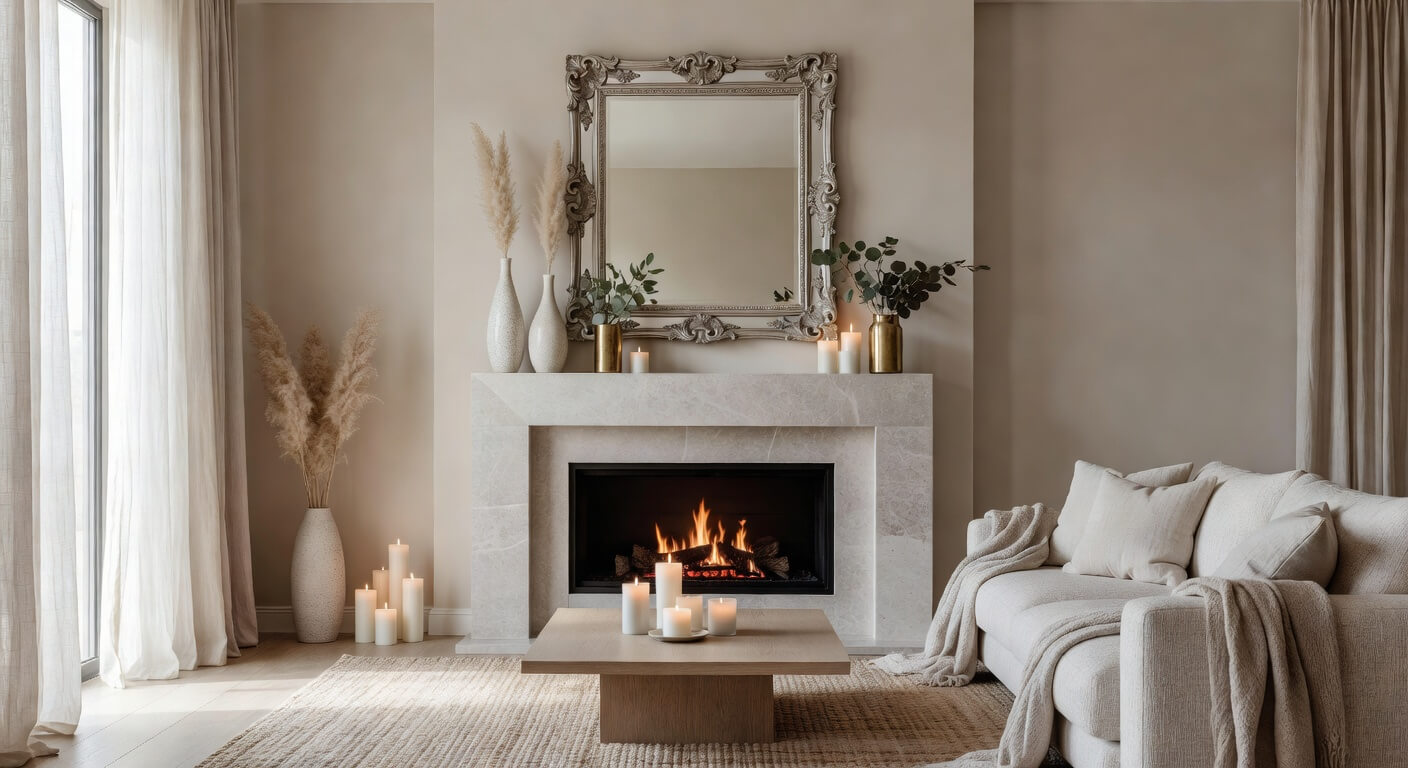 A large statement mirror above fireplace remains a classic for a reason. It reflects light, opens up the room, and gives the fireplace a refined focal point.