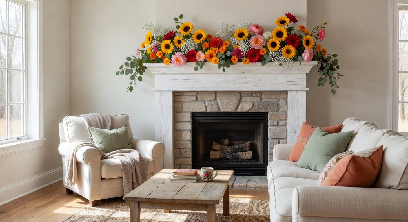 If you like changing your decor throughout the year, a seasonal floral arrangement above fireplace or on the mantel can keep things fresh. This idea gives your living room personality without requiring a full room makeover every few months.