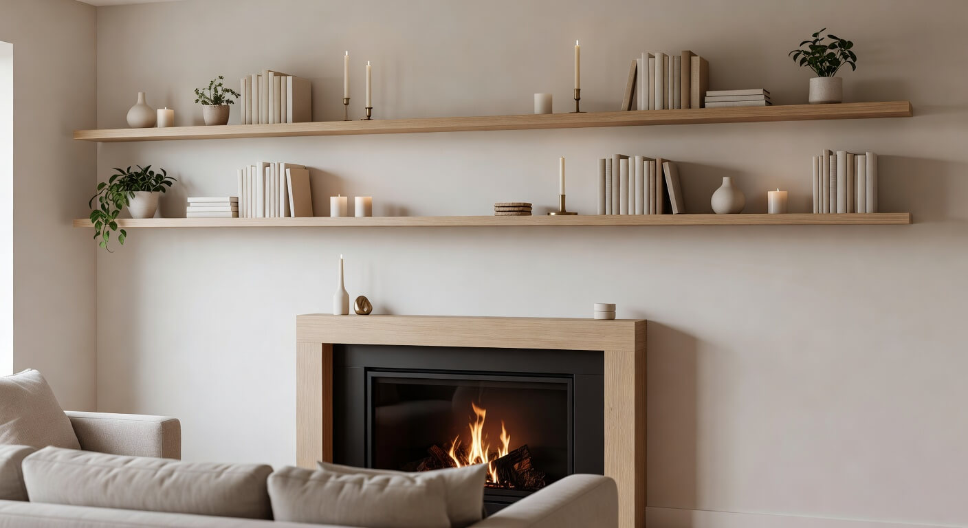 Floating shelves above fireplace give you flexibility, which makes them a smart choice if you like switching things up. They also let you blend practical storage with decorative styling.
