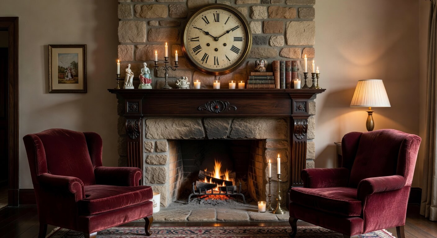 - Farmhouse space: rustic mantel, greenery, vintage clock