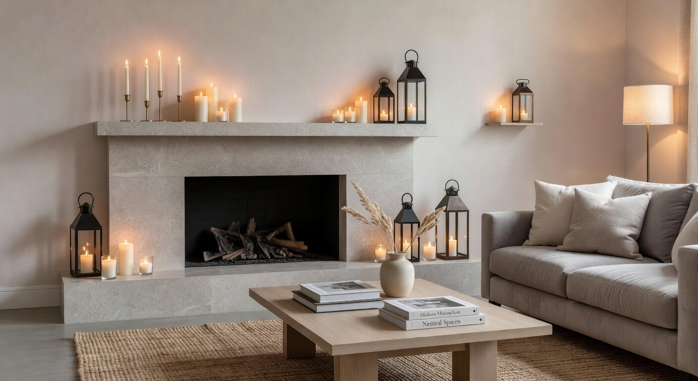 Candles and lanterns on a mantel create one of the coziest fireplace styling options out there. This approach feels warm, inviting, and easy to adjust for different seasons.