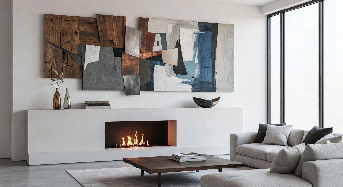 A modern abstract art collection above fireplace can turn your wall into a conversation piece. This look feels fresh, stylish, and a little bold in the best way.