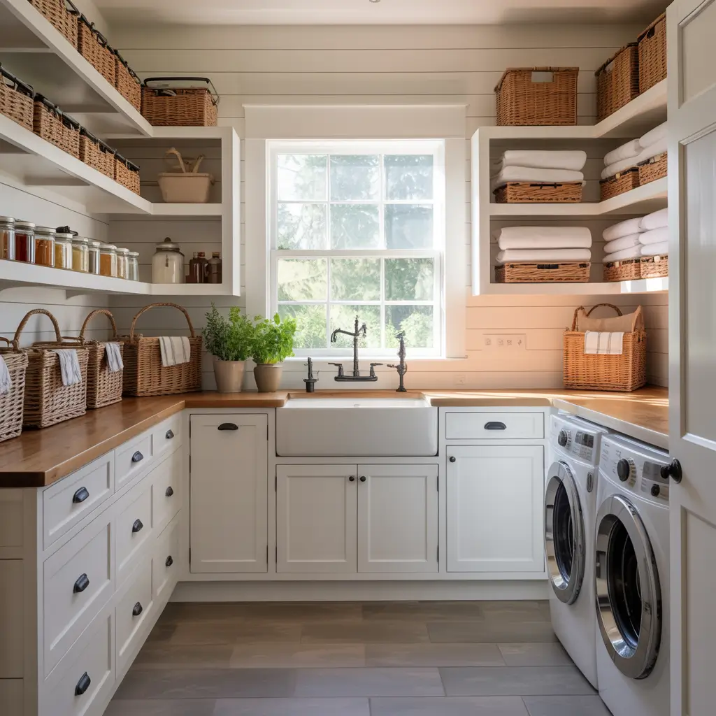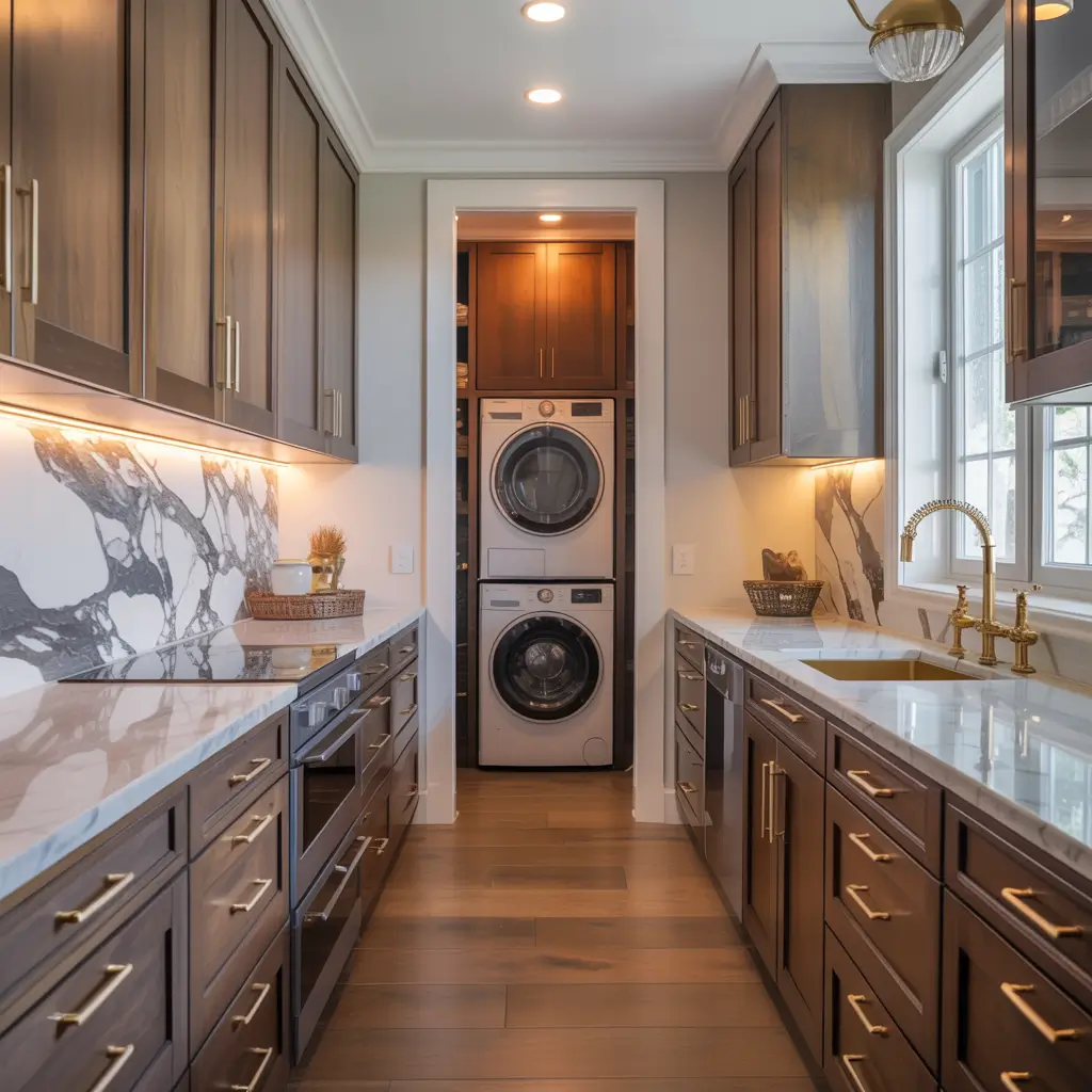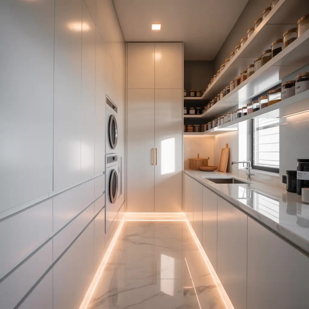 Imagine walking through from your kitchen, with floor-to-ceiling pantry storage on one side and a full laundry station on the other. Add an island in the middle if space allows – it’s a game-changer for folding and food prep. Include a second sink because why not? You’ve already gone luxury.