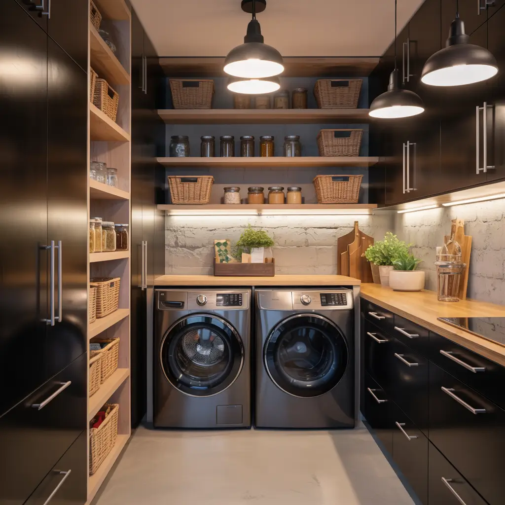 Exposed pipes, concrete floors, and metal everything – the industrial pantry laundry combo embraces the bones of the space instead of hiding them. This style turns utility into beauty, and honestly? It’s pretty badass.