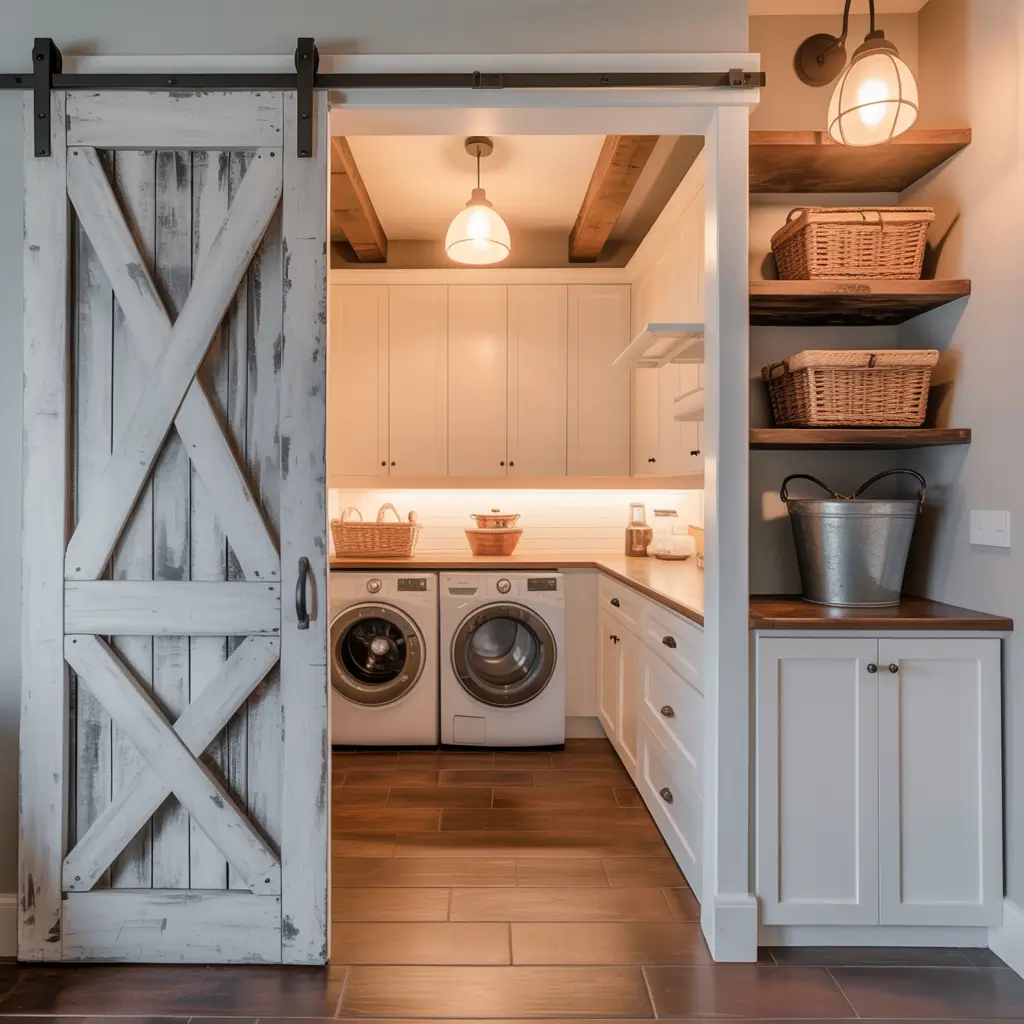 Install a barn door to separate your pantry section from your laundry area, or use it as the main entrance to the combo room. The door itself becomes a design feature – go rustic with reclaimed wood, modern with a sleek panel, or bold with a painted statement color.