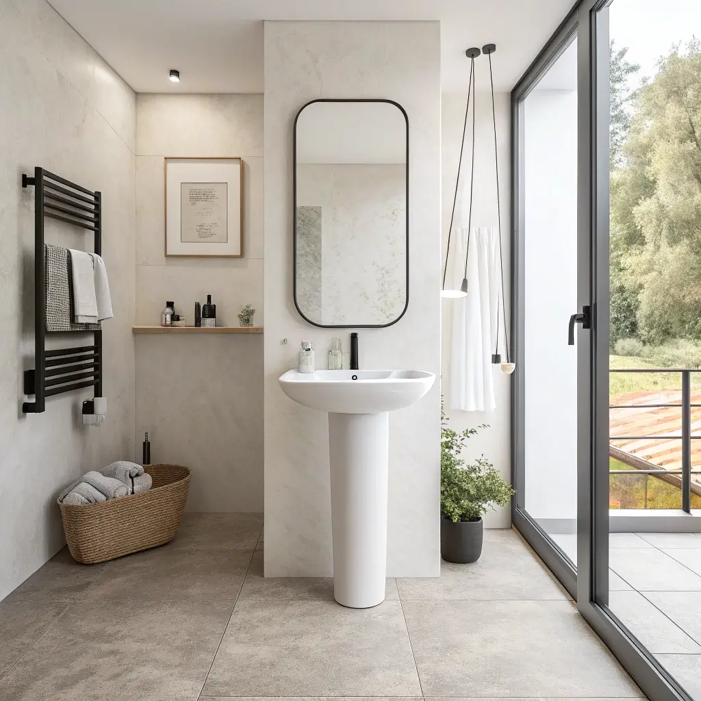 What really makes this style sing? Matte black fixtures. Seriously, swap out those chrome taps for matte black ones and watch your bathroom instantly look like it belongs in a design magazine. Keep your color palette strictly neutral – whites, grays, and maybe a touch of natural wood if you’re feeling wild.