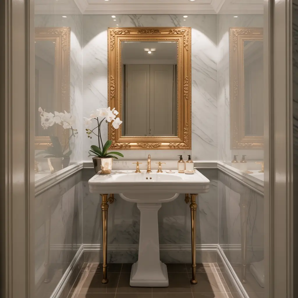 The beauty of powder room pedestal sinks is their proportion. Choose a sink that’s deliberately small – it makes the space feel intentional rather than cramped. Add one show-stopping element, whether it’s wallpaper, a piece of art, or a mirror, and call it done.