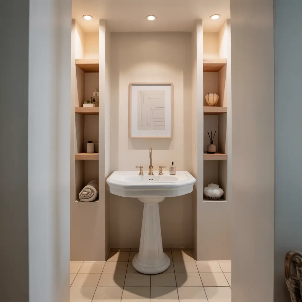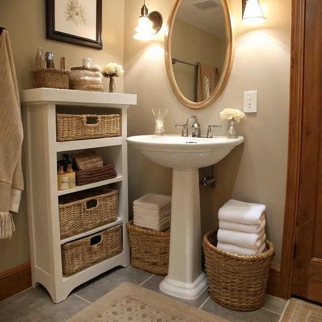 The ultimate hidden storage trick? Buy a pedestal sink with a wider base and install a narrow shelf inside the pedestal itself. Most people never notice it, but it holds cleaning supplies perfectly.