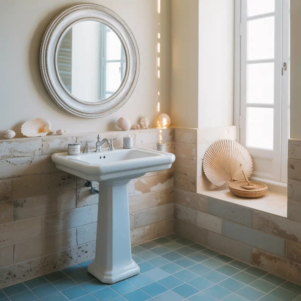 The best part about coastal pedestal sinks? They work anywhere. You don’t need an ocean view to pull off this style – just the right color palette and a few natural elements.