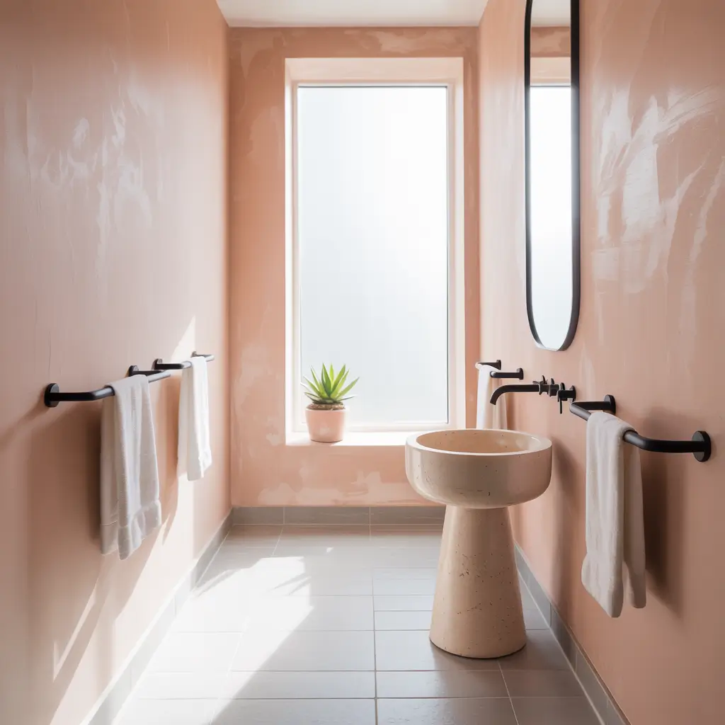 Sometimes the best designs whisper instead of shout. Soft pink walls with carefully chosen black accents create this zen-like atmosphere that makes every bathroom visit feel like a mini spa retreat.