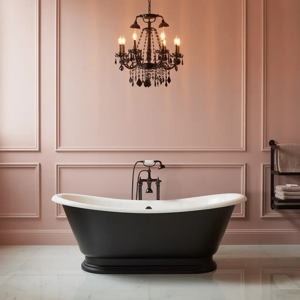 Want to really make this work? Keep your other fixtures black too. Black taps, black shower fixtures, maybe even a black chandelier if you’re feeling fancy. The cohesion makes the pink walls feel intentional rather than random.